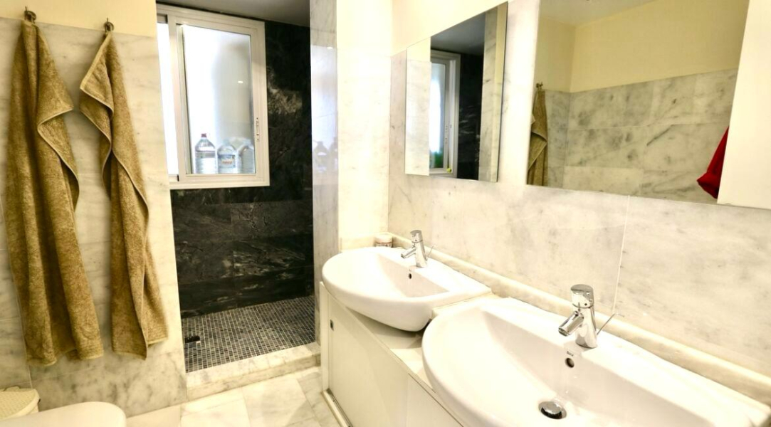 Video entrance system, underground parking, shutters that open partially and marble topped vanity units.